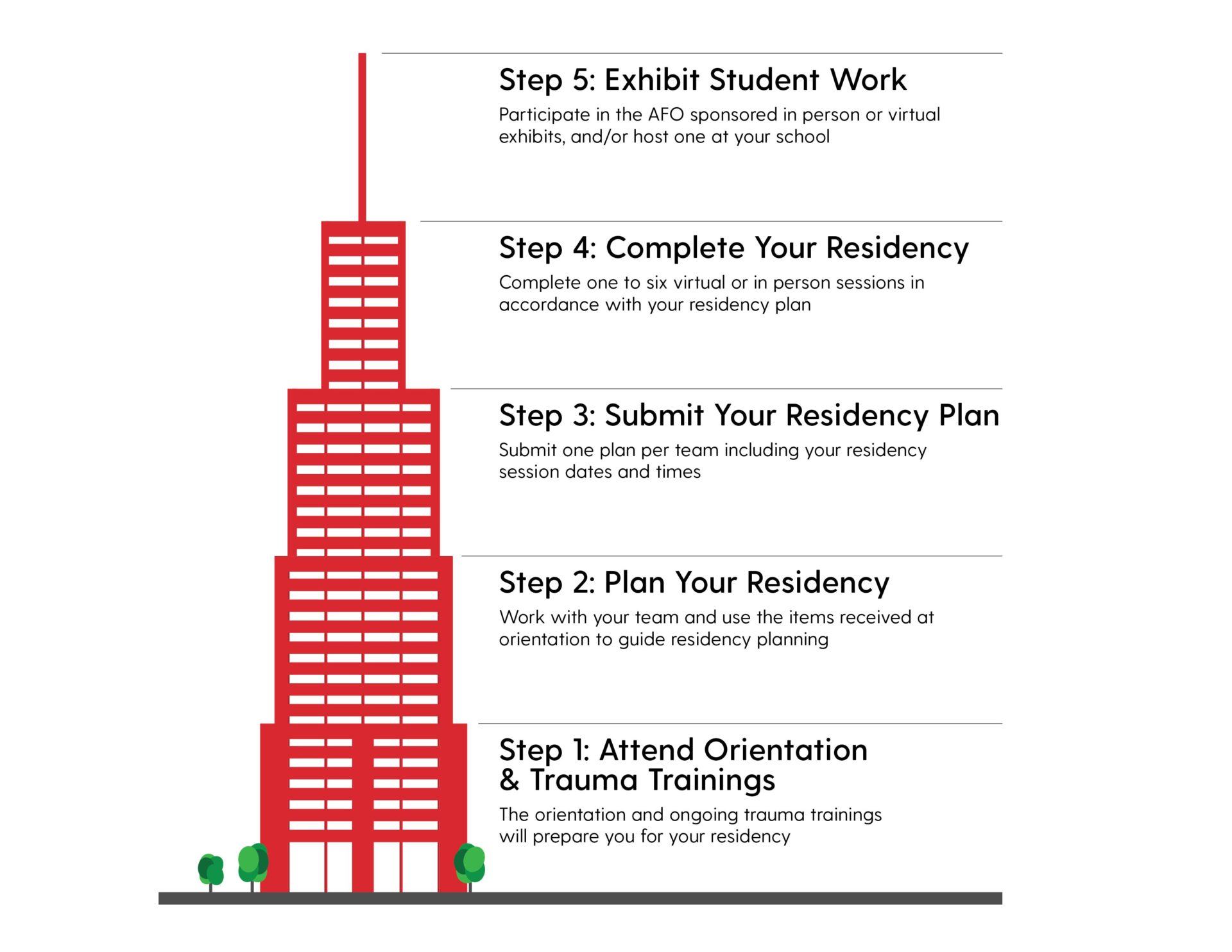 - Submit your residency plan (by February) – Before your residency begins please submit a plan (one per team) along with session dates and times using this form. Send AFO staff any changes to your plan throughout the residency.