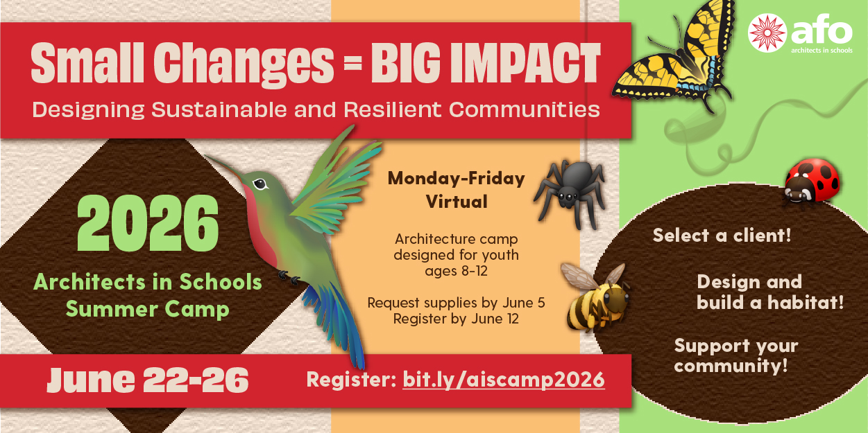 Virtual EventJoin us June 22-26, 2026, for our annual Architects in Schools Summer Camp! The virtual camp is designed for youth ages 8-12. Register by 5pm PT on June 12 to … Continue reading "Architects in Schools Summer Camp"